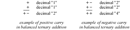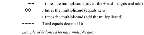 Balanced ternary arithmetic Balanced ternary, also called signed ternary, is a variation of Base-3 notation in which each digit can be expressed as either a negative one, a zero or a positive one, written as –, 0 and + by Fowler. The chart at the right shows decimal (Base-10) values from -16 to +16, and their corresponding values in Base-3 and balanced ternary. Arithmetic in balanced ternary is much like that for any alternate base, with the exception that there could be both negative and positive digits in the expression of a number. This means that in addition and subtraction there might be both positive and negative carries required to adjacent digits. From the chart, it can be observed that the negative value of any balanced ternary number can be obtained by simply replacing every + with a – and vice versa. It can be easier to subtract a number by inverting the + and – digits and then using normal addition (this technique is used in several of the examples below). Another feature of balanced ternary is that it can express negative values as easily as positive ones, without the need for a leading negative sign as with decimal numbers. Multiplication in balanced ternary is done in a very similar fashion to decimal multiplication. Using the standard practice of multiplying one factor (the multiplicand) by the other factor (the multiplier) one digit at a time, the decimal equation (12 times 123 equals 1476) is calculated in decimal as follows: Similarly in balanced